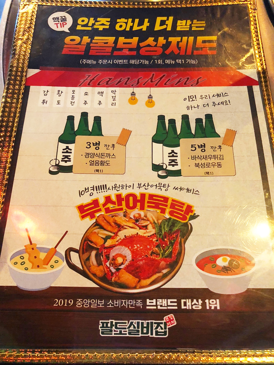 '알콜 보상제도'가 신기하네요 주메뉴 주문 후 소주병에 따라 추가 안주가 나옵니다