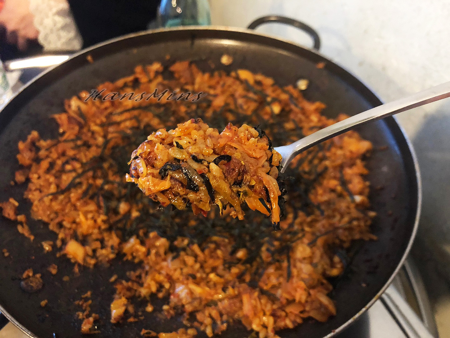 볶음밥의 필수인 눌러서 판에 약간 그을리게 해줍니다